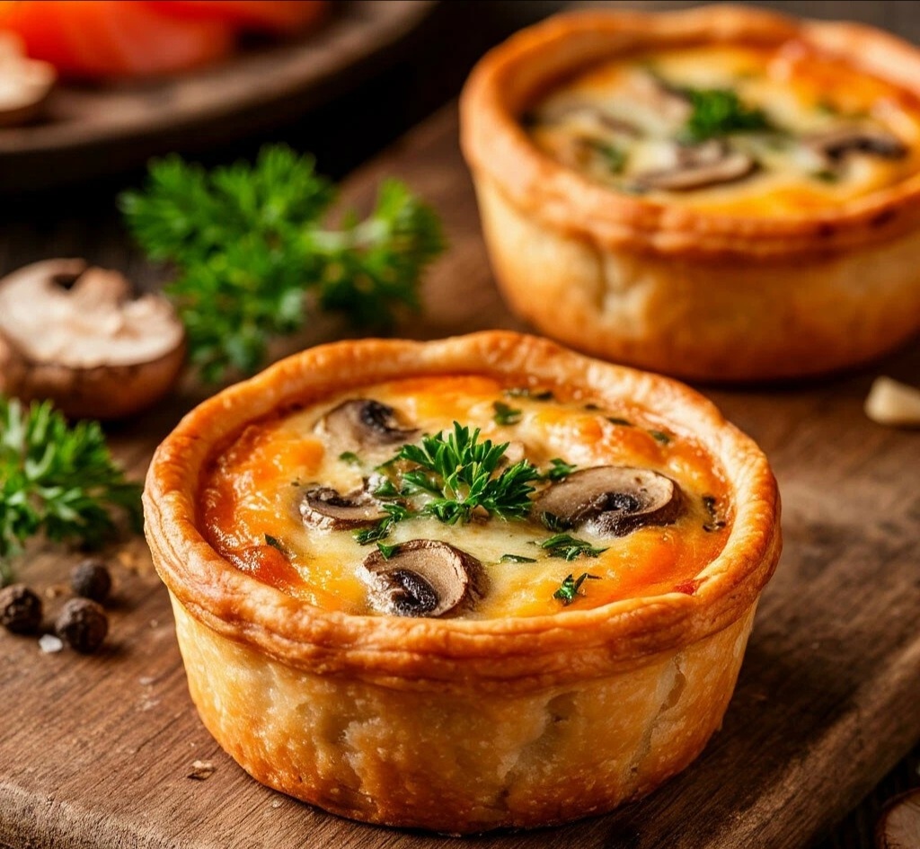 НЕСЛАДКАЯ ВЫПЕЧКА — МИНИ-КИШИ С ГРИБАМИ И ЛОСОСЕМ Мяу, мои пушистые гурмэ! 😻🥧 Сегодня готовим изысканную французскую выпечку — нежные мини-киши с грибами и лососем! Это же просто объедение! 🇫🇷✨ Идеально для уютного вечера! 🕯️ МИНИ-КИШИ С ГРИБАМИ И ЛОСОСЕМ 🥧🍄🐟 ИНГРЕДИЕНТЫ (на 6-8 мини-кишей): 🧾📝 •Слоеное тесто бездрожжевое (пласт) — 250 г •Шампиньоны — 200 г 🍄 •Лук репчатый — 1/2 шт. (около 70 г) 🧅 •Лосось слабосоленый — 100 г 🐟 •Сыр Чеддер (или другой твердый сыр) — 80 г 🧀 •Яйца — 2 шт. 🥚 •Сливки 10% — 150 мл 🥛 •Соль, перец черный — по вкусу 🧂 •Растительное масло для жарки ВРЕМЯ ПРИГОТОВЛЕНИЯ: ⏰ 40 минут (+ время на разморозку теста) 🕧 СЛОЖНОСТЬ:🐾 Нужна сноровка 🐱 ПОШАГОВЫЙ РЕЦЕПТ: 👩🍳✨ 1. 🔥 Духовку разогрейте до 180°C. Тесто разморозьте 2. 🍄 Лук и грибы обжарьте до золотистого цвета. Дайте остыть 3. 🐟 Лосось нарежьте мелкими кубиками. Сыр натрите на терке 4. 🥚 В миске взбейте яйца со сливками, солью и перцем 5. 🥧 Раскатайте тесто, вырежьте кружки. Разло