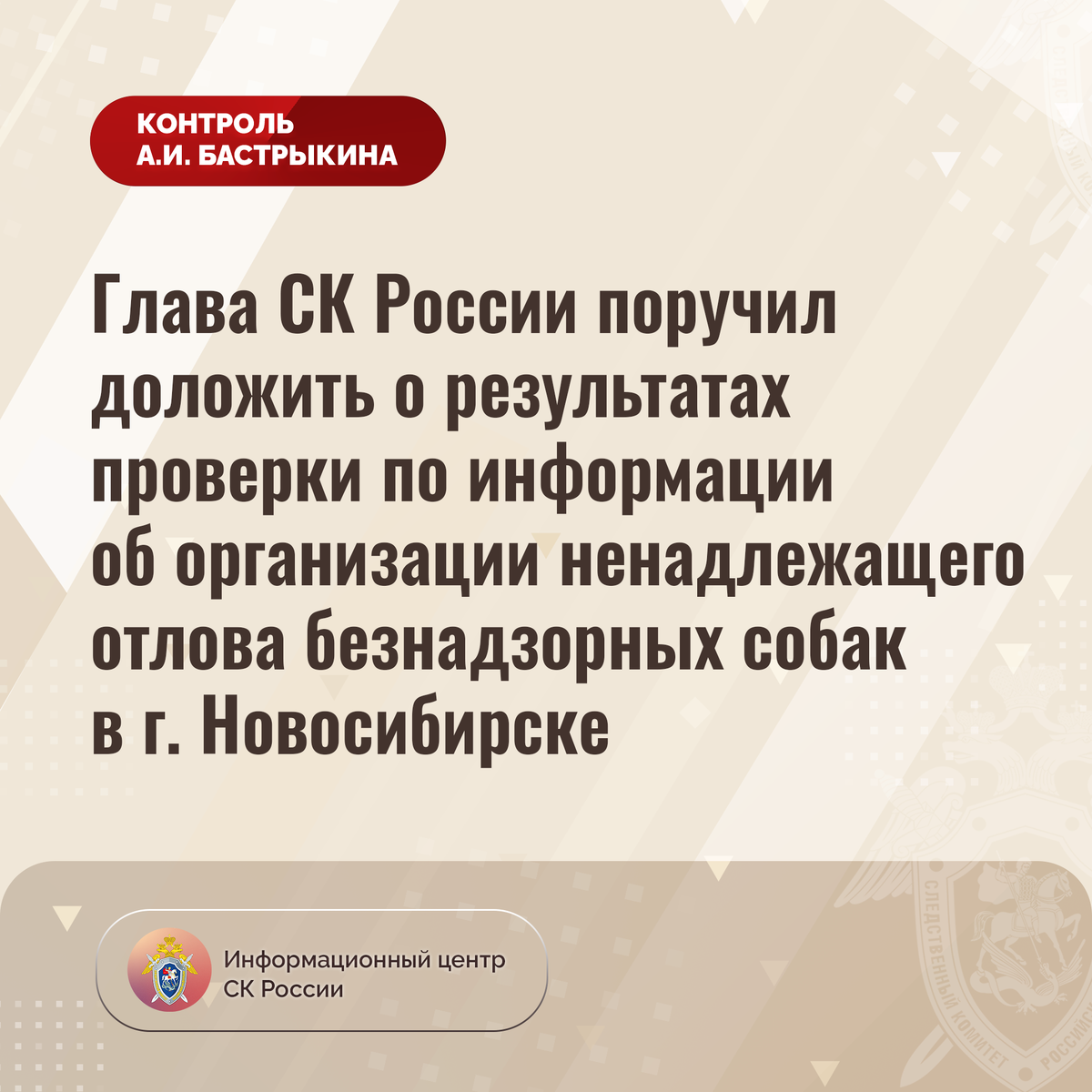 Глава СК России поручил доложить о результатах проверки по информации об организации ненадлежащего отлова безнадзорных собак в г. Новосибирске В СМИ сообщается, что на протяжении длительного времени в одном из жилых районов города Новосибирска обитает большое количество безнадзорных собак, которые систематически нападают на местных жителей. Так, стая агрессивных животных набросилась на пенсионерку, однако получения ею телесных повреждений удалось избежать благодаря оказанной очевидцем помощи. Несмотря на имеющиеся нарушения, до настоящего времени проблема не решена. В СУ СК России по Новосибирской области организована процессуальная проверка. Председатель Следственного комитета Российской Федерации Александр Иванович Бастрыкин поставил ход процессуальной проверки на контроль в центральном аппарате ведомства и поручил руководителю СУ СК России по Новосибирской области Евгению Геннадьевичу Долгалеву представить доклад о промежуточных результатах процессуальной проверки и принятом по ито