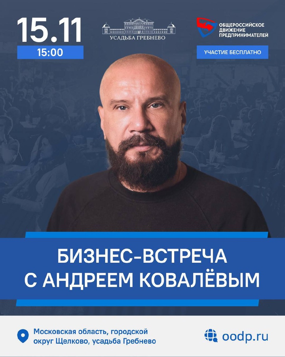 15 ноября в 15:00 | моя бизнес-встреча в усадьбе Гребнево Поговорим об экономической ситуации в стране и мире, о бизнесе и жизни. Обсудим актуальные новости и наболевшие проблемы. Конечно же, отвечу на ваши вопросы! Вход свободный и бесплатный. До встречи! ✅ АНДРЕЙ КОВАЛЕВ | reformator.ru | oodp.ru