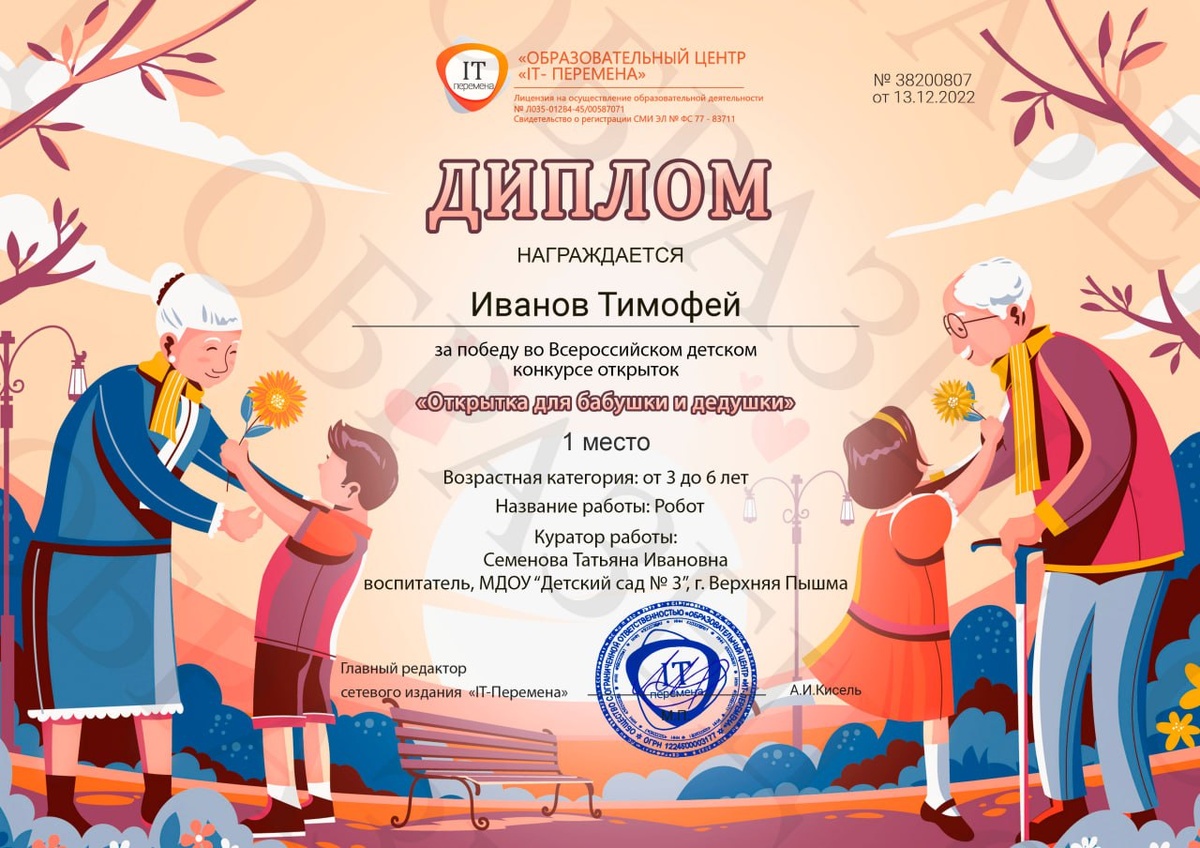 Мы подвели итоги бесплатного Всероссийского детского творческого конкурса "Открытка для бабушки и дедушки"! Результаты и наградные документы уже размещены в нашем новом поисковом телеграм-боте "Переменка": https://t.me/itperemenka_bot На сайте на странице результатов итоги будут опубликованы 3 ноября в 8:00 по МСК. Заказать оригиналы наградных документов, напечатанных в высоком качестве на плотной бумаге, можно под соответствующим дипломом.