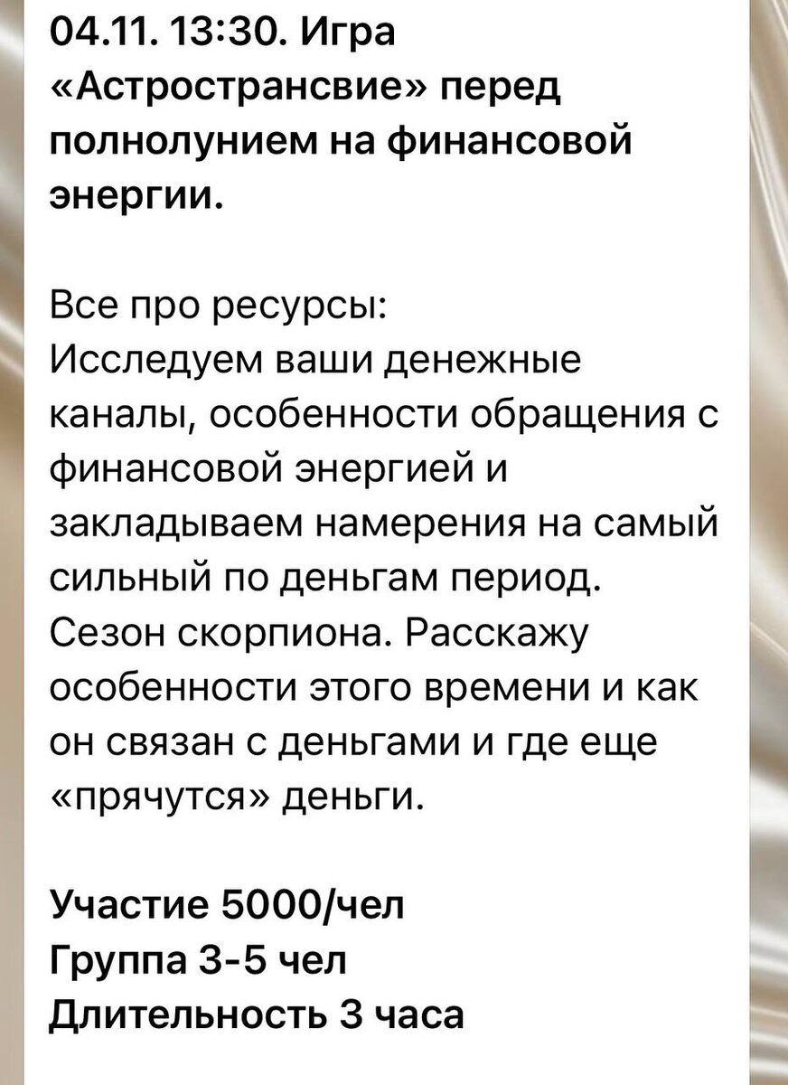 4.11 в 13:30 игра Астространсвие. Заранее напоминаю про еще одну денежную прокачку и возможность в сильнейший для этого день перед полнолунием в тельце 💚 Исследуем ваши финансовые каналы через астрологию, метафорические карты, психологию. В помощью заранее построенного мной маршрута для вас, определенных вопросов игры вы получите: -понимание вашей финансовой стратегии -тактику обращения с деньгами -что усиливает и что блокирует финансовые потоки -исследуете вашу теневую инерцию и узнаетте про ваши «легкие деньги» (не путать с женскими ) 😅 -про женские энергии влияющие на ваши ресурсы тоже узнаете и более того, получите подсказки о том, как эту энергию множить, усиливать. Все участники получат от меня сильную практику на это полнолуние 🌕 📍 Важно! Заявки принимаются до 3.11. Так как я заранее каждому анализирую карту и формирую маршрут на игру!. * для участия необходима ваша дата рождения, место и время хотябы примерное. Если знаете точное, это лучше.👐🏻