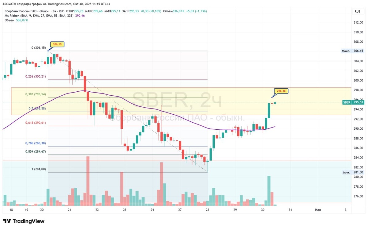 🏦 От последнего падения на -25 рублей #SBER скорректировался в отбой на 61,8% по Фибоначчи и отскочил на +15 рублей - ровно до дневной