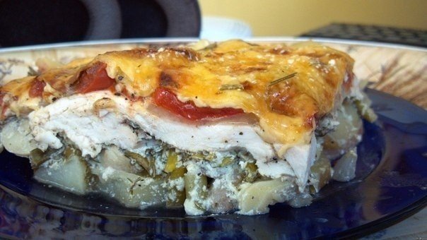 Ингредиенты: Картофель 3-4 клубня Шампиньоны 200-300 грамм Куриное филе 500 грамм Чеснок Сметана Помидоры Приготовление: На дно противня, выстланного бумагой для выпекания, выкладываем слоями: Порезанный ломтиками картофель, порезанные пополам шампиньоны, далее слой сметанного соуса (соус делаем из нашинкованной зелени, пары раздавленных зубчиков чеснока и 400 гр упаковки сметаны соль и специи по вкусу), порезанное на кусочки мясо, ломтики помидора, тертый сыр. Выпекаем минут 35-40 в духовке при 200 гр. Опять же, советую сразу не есть, а дать настояться минут 15-20 для того, чтобы выделившийся в процессе приготовления сок впитался обратно и блюдо стало еще сочнее. Получается очень ароматно и вкусно! Приятного аппетита!