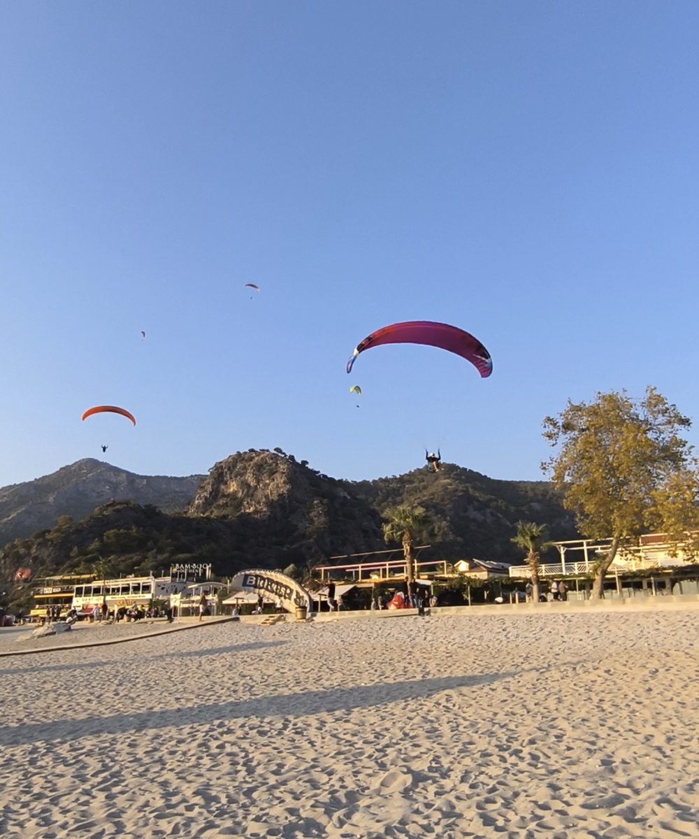Олюдениз раскинулся на берегу в окружении гор высотой от 1200 до 2000 метров. Это место сумасшедше популярно у парапланеристов. Такого количества их, как здесь, я не видел нигде. Взлет с горы Бабадаг высотой 2000 метров происходит буквально каждые 20-30 секунд, весь день без перерыва. И немудрено — настолько завораживающих пейзажей я не видел даже на картинках. Ведь у подножия горы омывают два моря — Эгейское и Средиземное, и именно здесь находится жемчужина Турции — Голубая лагуна.
