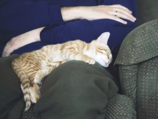 Кошка забралась на колени хозяину перед визитом гостя