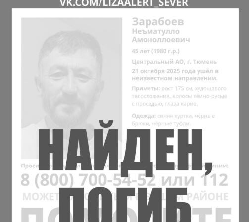 В Тюмени пропавшего 9 дней назад мужчину нашли мертвым. 45-летний Неъматулло Зарабоев исчез 21 октября, с тех пор о его местонахождении ничего не было известно. «Найден, погиб», – такое сообщение появилось на официальной страничке поискового отряда «ЛизаАлерт в Тюменской области». Что случилось с пропавшим – неизвестно. Ранее мы писали, что в селе Перевалово завершились поиски 43-летней Алены Красновой, пропавшей 8 октября. К сожалению, они обернулись страшной находкой – женщину убили. В другом случае, произошедшем в Тюмени, молодой человек жестоко зарезал 21-летнюю соседку, после чего от лица убитой переписывался с ее родными.