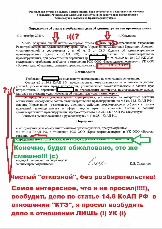 В ответе Управления Роспотребнадзора по Краснодарскому краю от 16.10.2025 № 23-00-03/20-15940-2025 (подписан заместителем руководителя Перякиной Н.М.) мне направлено определение об отказе в возбуждении дела об административном правонарушении от 01.10.2025(!?), составленное ведущим специалистом-экспертом Солдатовой К.Я.