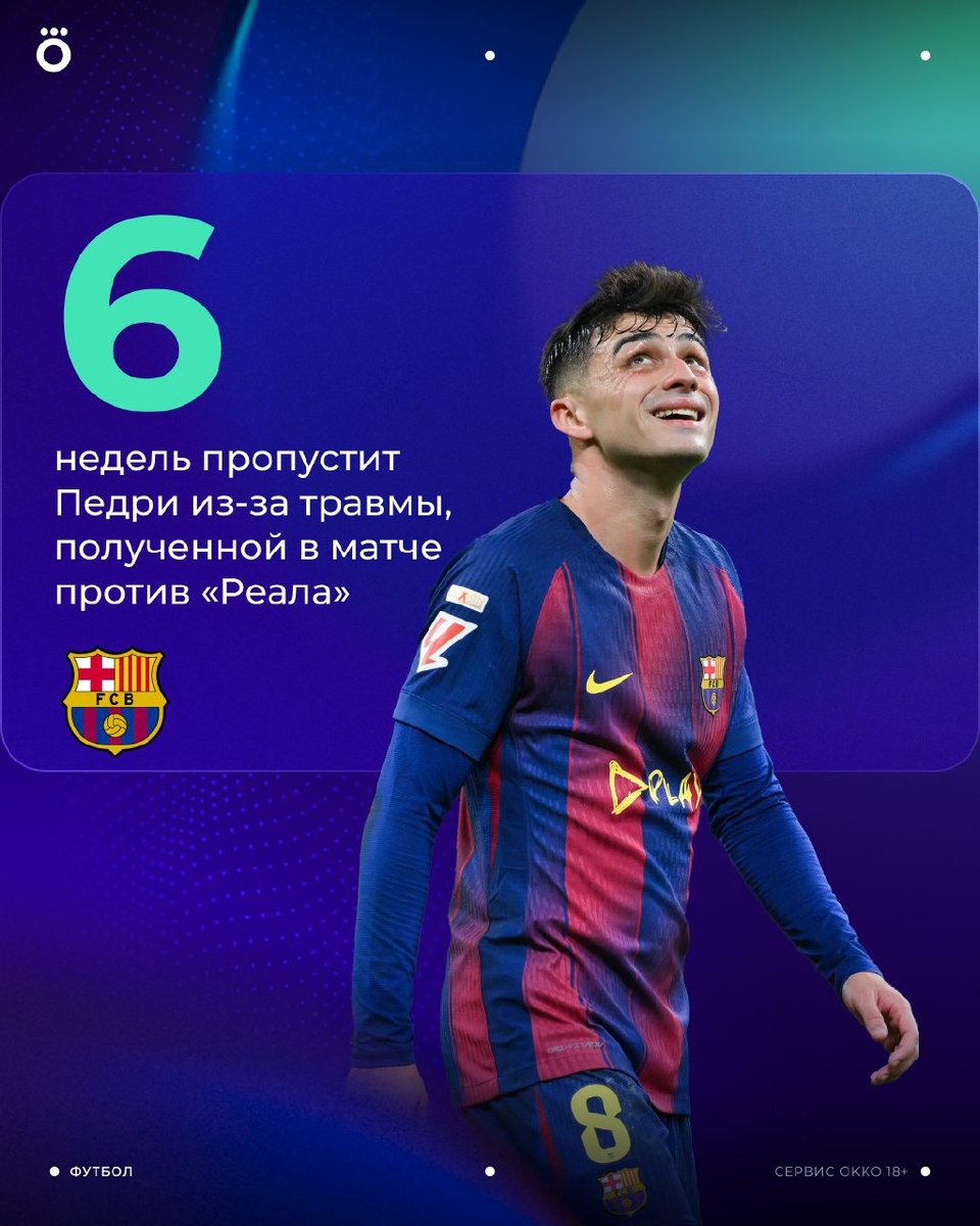 Травмы продолжают мучить «Барсу» 🤕 Клуб сообщил, что Педри пропустит около 6 недель из-за разрыва дистальной части двуглавой мышцы левого бедра, полученного во время Эль Класико. Теперь в лазарете каталонцев — уже 8 травмированных футболистов. Мрак 🫠
