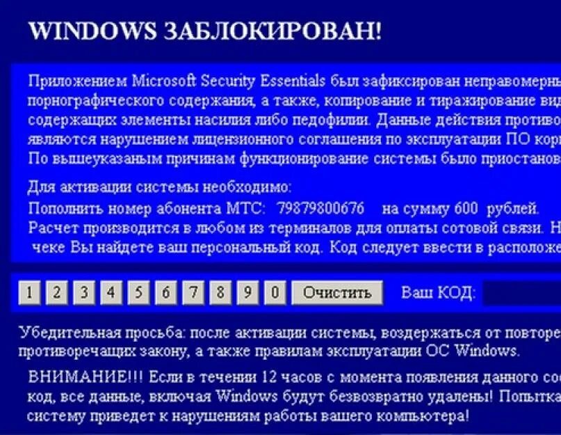 Угрожающие сообщения: "Ваш компьютер заблокирован за просмотр детской порнографии, распространение нелицензионного ПО или другую противозаконную деятельность!"