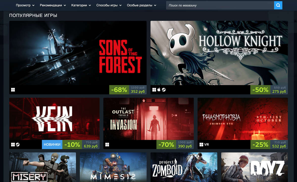 Во время хэллоуинской распродажи Стим часто появляются наборы (бандлы), в которые входят несколько игр одной серии. Иногда стоимость всего комплекта оказывается ниже, чем цена одной из игр отдельно. Проверяйте вкладку «Bundles» на страницах тайтлов — там можно сэкономить до 70–80%.