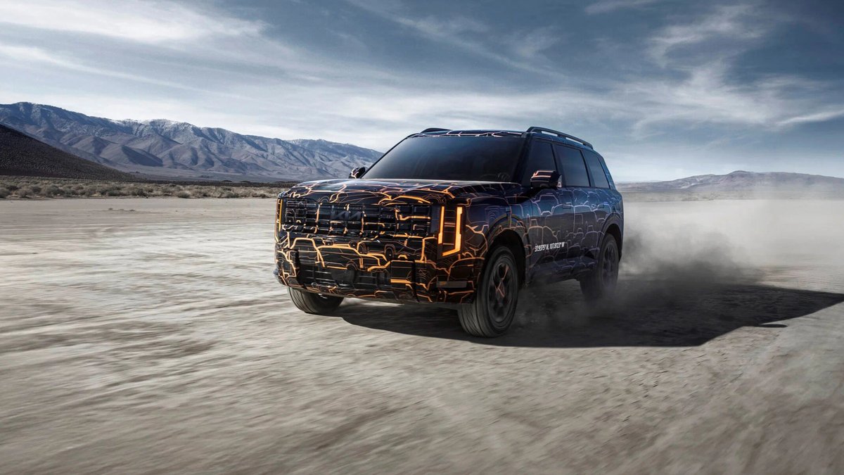 Компания Kia представила новые фотографии обновленного кроссовера Telluride. Автомобиль, покрытый необычным камуфляжем, позволяет оценить его дизайн с различных ракурсов. Дебют модели запланирован на 20 ноября. Благодаря свежим снимкам можно полностью рассмотреть силуэт Telluride, который оказался более округлым, чем ожидалось по предыдущим тизерам. Боковые линии кроссовера плавные, с четко выраженными колесными арками, а задние стойки имеют динамичный наклон. Фотография кроссовера спереди демонстрирует вертикальную головную оптику с полосками дневных ходовых огней, а также массивный бампер и сетчатую радиаторную решетку. Логотип на борту кроссовера отсылает к городу Telluride в штате Колорадо. Дизайн камуфляжной пленки вдохновлен ранними эскизами автомобиля. Согласно предварительной информации, новый Kia Telluride получит два варианта силовой установки. Первый — это 3,5-литровый V6 мощностью 291 л.с. Второй вариант — гибридная система, включающая 2,5-литровый турбомотор и два электрод