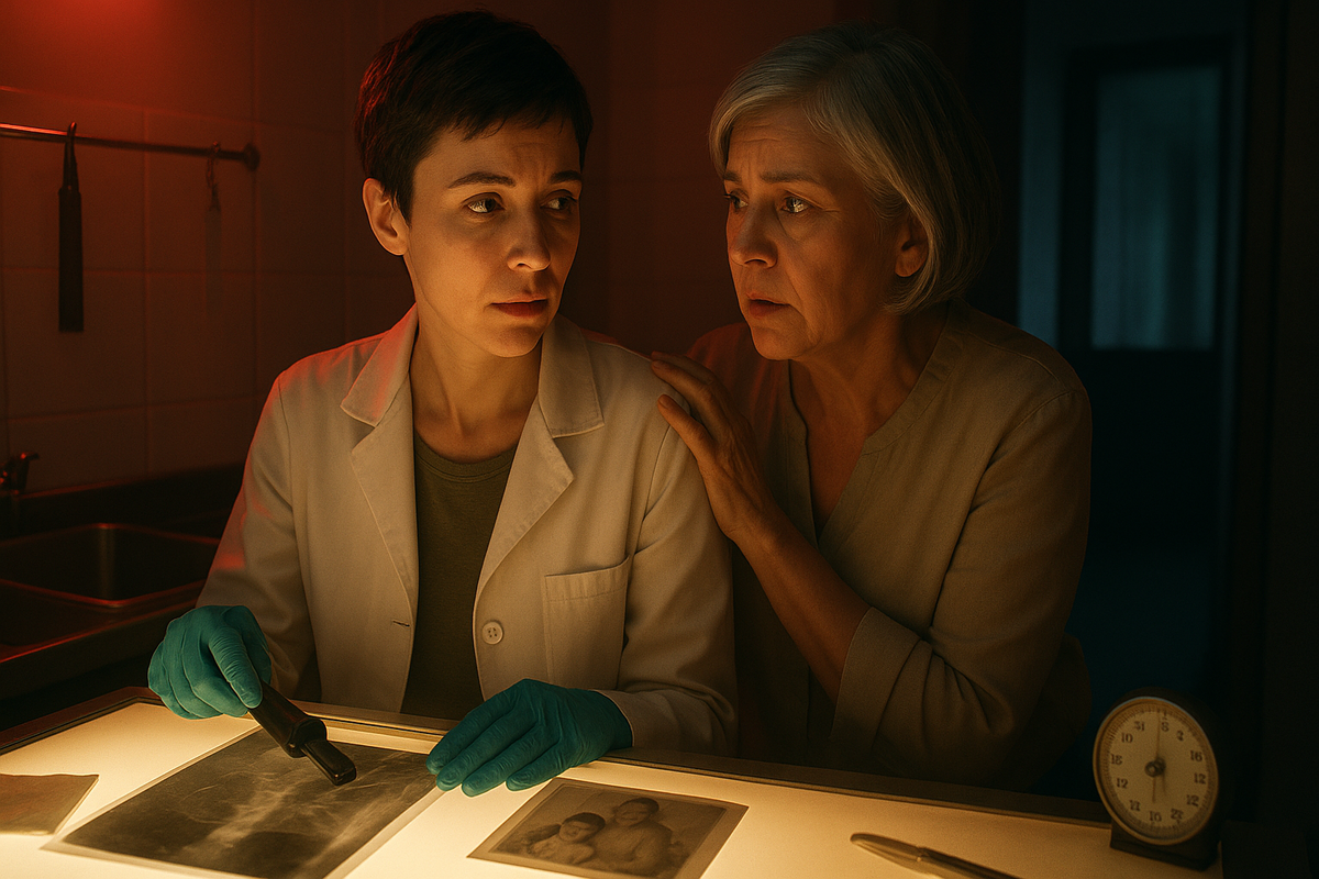 Я в проявочной. Красная лампа дрожит, как век. Воздух тёплый, химический, со сладкой кислинкой, от которой першит язык. На световом столе — маленькое фото «мама и я». Сверху — мокрая рентген‑плёнка. Я веду валиком по стеклу. Сейчас проявится не кадр. Истина.