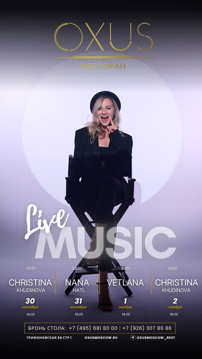 Обволакиваем уютом, согреваем любовью и ждём на мелодичный ужин в OXUS под аккомпанемент живой музыки: 30.10 | четверг | 19:00 | CHRISTINA KHUDINOVA | solo 31.10 | пятница | 19:00 | NANA HATL | solo 1.11 | суббота | 19:00 | VETLANA | solo 2.11 | воскресенье | 19:00 | CHRISTINA KHUDINOVA | solo Бронь столика в лс: Ресторан OXUS +7(495) 681 80 00 +7(926) 307 86 86 (WA/TG) Сайт, telegram