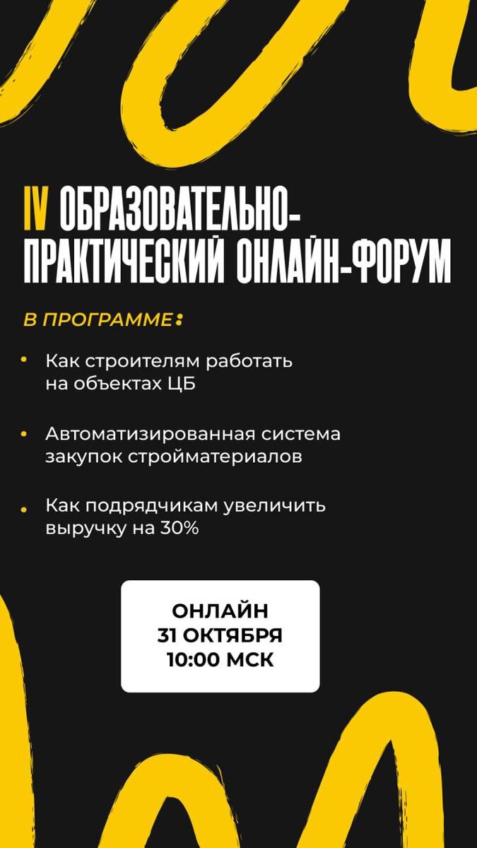 Приглашаем на бесплатный четвертый образовательно-практический онлайн-форум. 📅 31 октября | 10:00–11:30 (МСК) Формат: онлайн-трансляция в Контур.Толк Организатор: Комитет по развитию малого и среднего строительного бизнеса Национального объединения строителей (НОСТРОЙ). ПРОГРАММА С ПРАКТИЧЕСКИМИ КЕЙСАМИ: 🔹 10:00–10:30 | ОВЧИННИКОВА Ксения Тема: «Как строителям поработать на объектах ЦБ» Спикер: Начальник Управления закупок Уральского ГУ Банка России 🔹 10:30–11:00 | НАСОНОВ Алексей Тема: «Автоматизированная система закупокстройматериалов для строительных подрядчиков.» Спикер: Директор направления «Строительство и эксплуатация» Офиса перспективных продуктов Корпоративного центра ПАО «Ростелеком» 🔹 11:00–11:30 | ФЕДОРЕНКО Наталия Тема: «Как подрядчикам увеличить выручку на 30%» Спикер: Председатель Совета Ассоциации Саморегулируемой организации проектировщиков «Альянс проект» 🔗 Чтобы мы могли направить Вам ссылку на подключение к форуму, пожалуйста, зарегистрируйтесь