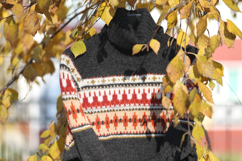 Берегла для показа в сезон, и так берегла, что забыла:) Пока ещё не лёг снег, пока ещё +5, представляю вашему вниманию его - свитер, связанный из тёмно-серого, практически чёрного, мериноса "Йорк": Хотя узоры здесь и не такие осенние, а даже геометрически всесезонные, из-за фотографий, сделанных в тот период, когда ещё все листья были и желты, и находились на деревьях, свитер прочно ассоциируется с осенью. Осенью 4-летней давности, потому что связан он был именно тогда. От нынешней погодной осени остаётся буквально пару дней, но до снега показать "сезонный свитер" я успела. Вот он в полный рост, удлинённый, расклешённого А-силуэта, из пряжи Йорк, для которой создала, наконец-то, отдельную подборку. Пряжа тонкая, 460м/100г, но свитер связан на спицах 3,5 на основу (и жаккард). Узор был фантазийный, придумывала, из тех цветов, что были, потом повторила такой же рисунок в другом свитере, но адаптировав его под светлый фон. Общий вес свитера 285 грамм, эта пряжа очень лёгкая по весу, несмо