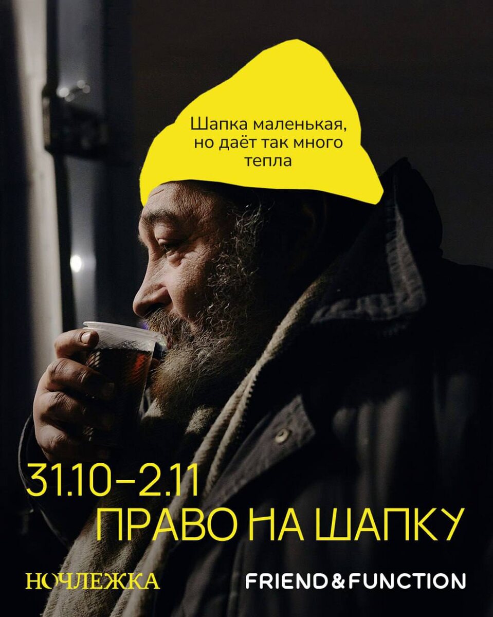 Зима близко, и найден самый быстрый способ помочь бездомным. Суть акции проста: купите на сайте http://FriendFunction.ru/ или в одноименном шоуруме шапку, а вторую владельцы отправят в Ночлежку и подарят немного тепле тем, кто в нем особенно нуждается.