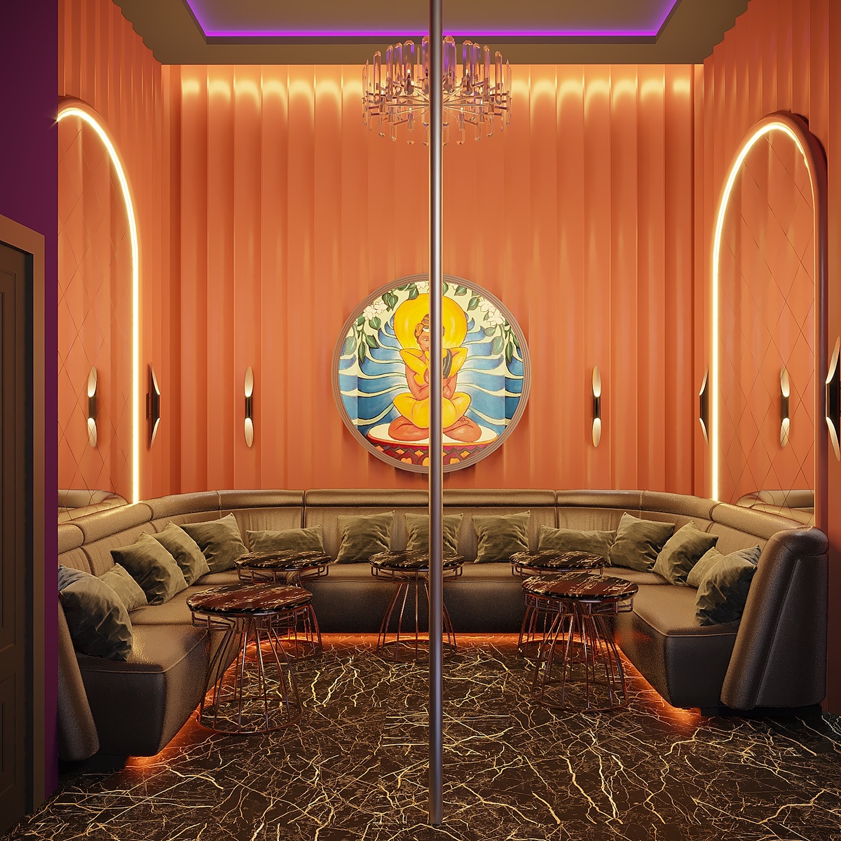 Интерьер этого мужского клуба создан для того, чтобы захватывать внимание с первого шага. Здесь пространство становится частью сценария — мягкий свет, глубокие цвета и продуманные текстуры создают атмосферу, в которой комфорт соединяется с провокацией. Главный зал окутан полумраком — тёплые акценты света и неоновые отблески мягко скользят по стенам, облицованным чёрным мрамором с антрацитовыми прожилками. Этот материал отражает свет ровно настолько, чтобы добавить загадочности и глубины. Вход оформлен как аллея красных фонарей, — приём, который сразу задаёт эмоциональный тон. Он создаёт ощущение лёгкого запрета и притяжения, вовлекая гостя в атмосферу клубного мира. В центре — сцена, вокруг которой выстроен полукруг из мягких кожаных диванов тёплого коричневого оттенка. Такое планировочное решение обеспечивает идеальный обзор и создаёт чувство камерности. Барная стойка из чёрного мрамора с фиолетовыми акцентами добавляет сцене драматизма, а асимметричные светильники поддерживают рит