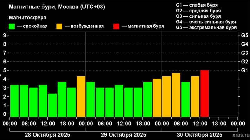 До этого бури фиксировались с 1 по 3, после 12 и затем с 18 по 19 число. Число магнитных бурь является повышенным второй месяц подряд: до этого 5 бурь произошло в сентябре после спада в конце лета.