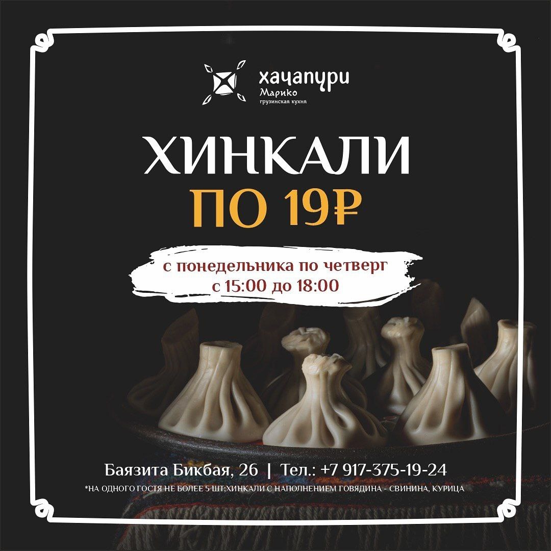 Хинкали по 19₽ в Хачапури Марико! ✔️В акции участвуют следующие начинки: говядина–свинина или курица. ✔️С понедельника по четверг — с 15:00 до 18:00 ✔️На одного гостя — не более 5 штук Не действует на доставку, самовывоз, праздничные дни и шоу-программы. Не суммируется с другими предложениями ✉️TG | ✍️ОБЗОРЫ | 💬VK |