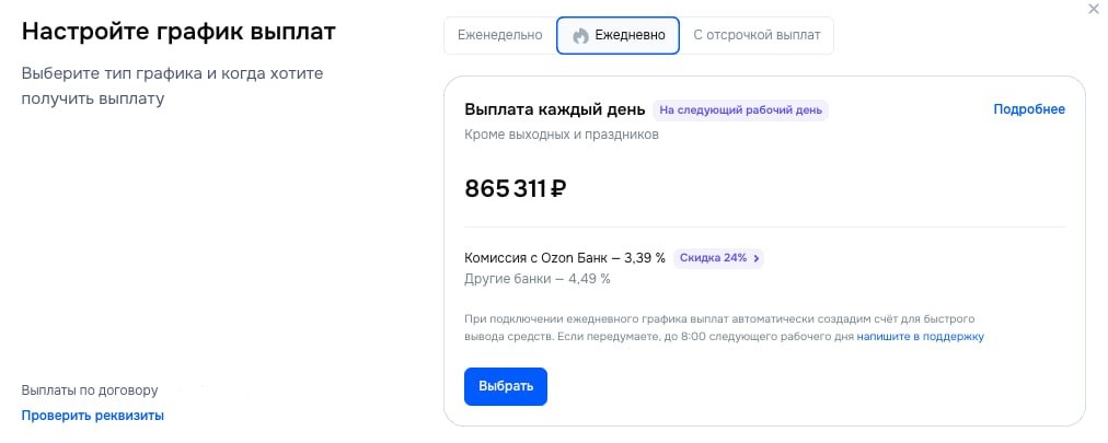 💰 Досрочная выплата на Ozon — инструмент, который может стоить вам 53,88% годовых ❓Многие селлеры в последнее время начали активно подключать досрочную выплату — услугу, позволяющую получить деньги за продажи раньше стандартных сроков. Но важно понимать: это платный инструмент, а не обязательный. 📉 Разберёмся в цифрах: — Комиссия Ozon за досрочную выплату составляет 4,49%, — или 3,39%, если у вас расчётный счёт в Ozon Банке. На первый взгляд кажется немного. Но если вы оформляете такую выплату каждый месяц, то это уже 53,88% годовых. 📌 То есть фактически вы отдаёте Ozon процент, сопоставимый с дорогим кредитом — просто ради того, чтобы получить свои же деньги чуть раньше. ✅ Что делать вместо этого: 1. Используйте стандартные бесплатные выплаты — они приходят без комиссии. 2. Если важен быстрый доступ к деньгам — выберите еженедельные выплаты с отсрочкой, это гораздо выгоднее: • Через неделю — 3,49% (2,59% с Ozon Банком) • Через 2 недели — 1,19% (0,89% с Ozon Банком) 📊 Вывод: