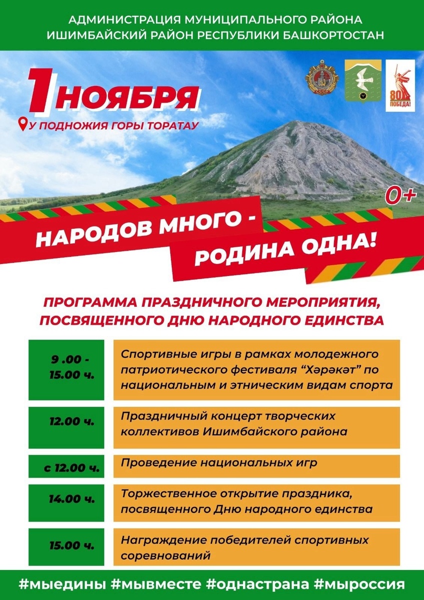Праздник «Народов много – Родина одна!» состоится у подножия легендарного шихана в субботу, 1 ноября. Он будет посвящён Дню народного единства, сообщает администрация Ишимбайского района. Одним из главных событий праздника станет молодёжно-патриотический фестиваль «Хәрәкәт» по национальным и этническим видам спорта. Он будет проходить с 9 до 15 часов. В 12 часов начнётся концерт от лучших творческих коллективов Ишимбайского района. В 14 часов состоится торжественное открытие праздника, а в 15 часов наградят триумфаторов спортивных состязаний. Добро пожаловать!