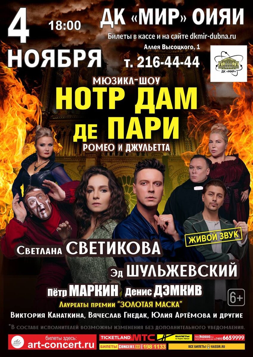 MUSICAL SHOW "НОТР ДАМ ДЕ ПАРИ" "РОМЕО И ДЖУЛЬЕТТА" 📆 4 ноября в 18-00 📍 Дворец культуры "Мир" г. Дубна 💳 Стоимость билетов от 1800 до 3500 руб. Купить билеты без комиссии - https://art-concert.intickets.ru/seance/66548085/ Светлана Светикова, Эд Шульжевский, Денис Дэмкив, Пётр Маркин, Вячеслав Гнедак и другие ведущие артисты самых известных, успешных и легендарных мюзиклов в яркой и увлекательной театрализованной программе МЮЗИКЛ-ШОУ. «Я душу дьяволу продам за ночь с тобой» - и можно больше ничего не говорить. За последние 10 лет эта фраза стала культовой. Она олицетворяет собой целый период в истории современной Российской культуры: эпоху музыкального театра, эпоху мюзикла. Жанр мюзикла уверенно завоевывает популярность в России. Москва и Санкт-Петербург становятся «русским Бродвеем» - в обеих столицах сейчас идут около десятка громких проектов. Наши артисты знакомы зрителям по мюзиклам «Нотр Дам де Пари», «Ромео и Джульетта», «Кабаре», «Три мушкетера», «Монте Кристо», «Маммам