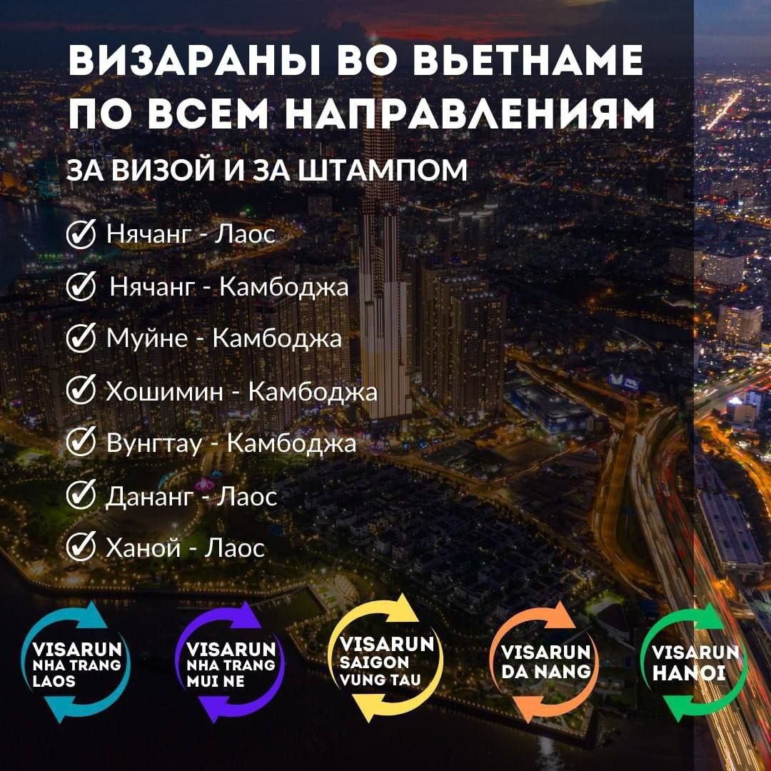 Визараны от Сергея Кириллова: 🚌🇰🇭В Камбоджу: Из Нячанга и Муйне: @visarunNT Из Хошимина и Вунгтау: @visarunvungtau 🚌🇱🇦Визараны в Лаос: Из Нячанга: @visarunBoY Из Ханоя: @visarunhanoi Из Дананга: @visarunDN Оформление визы во Вьетнам на 9⃣0⃣ дней Тем, кто едет впервые (или выехал больше месяца назад) 900.000đ ($36) - 3 рабочих дня (рд); Тем, кто выехал меньше месяца назад 1.500.000đ ($60) - 3 рд; 🚨Виза за 4 часа в день обращения - 2.100.000 (рабочие дни, рабочее время) - (идеально для визарана 🚌); Одобрить вашу заявку, которую вернули на доработку: 900.000đ ($36) - 3 рд. Оплата возможна в донгах, рублях, USDT. 📄✍️Консультации по общим визовым вопросам, обмен валюты - 7:00 до 02:00 - @kirillovsd и @visarunviet