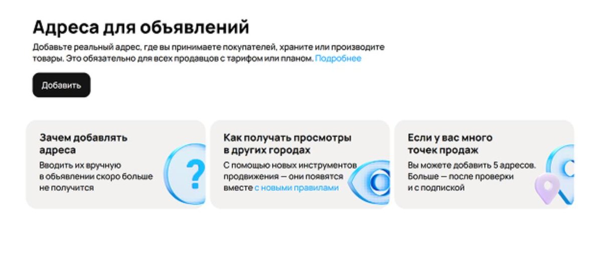 📌 При подключении Максимального тарифа можно подтвердить до 50 адресов на один аккаунт и дублировать объявления в городах с подтвержденными адресами.