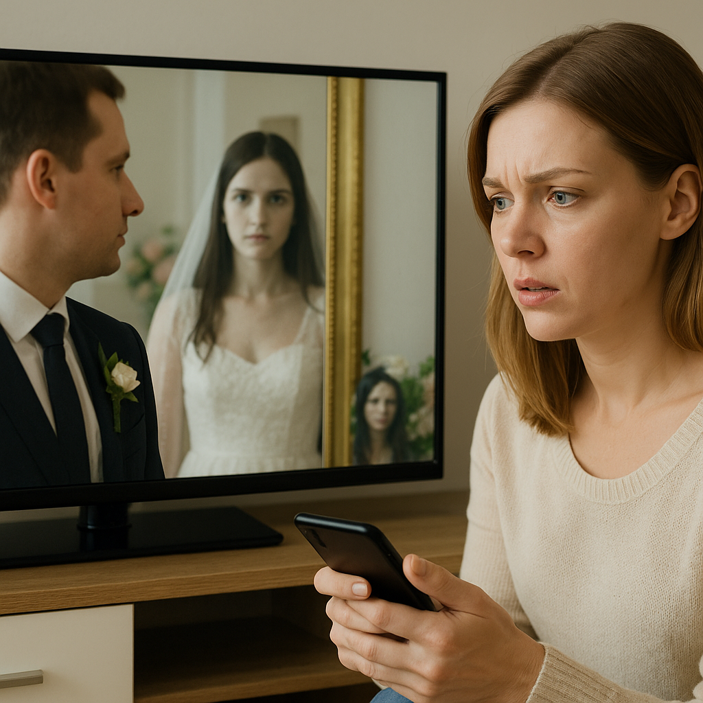 Он повернулся. Отражение было обычным — только они двое. Ни следа той женщины. Алина тяжело дышала, не веря своим глазам. Может, усталость? Недосып? Но когда муж пошёл на кухню, экран телевизора снова загорелся сам по себе — без пульта, без касания. На нём появилась та же сцена со свадьбы, но теперь фигура стояла не позади жениха, а прямо рядом с Алинoй.