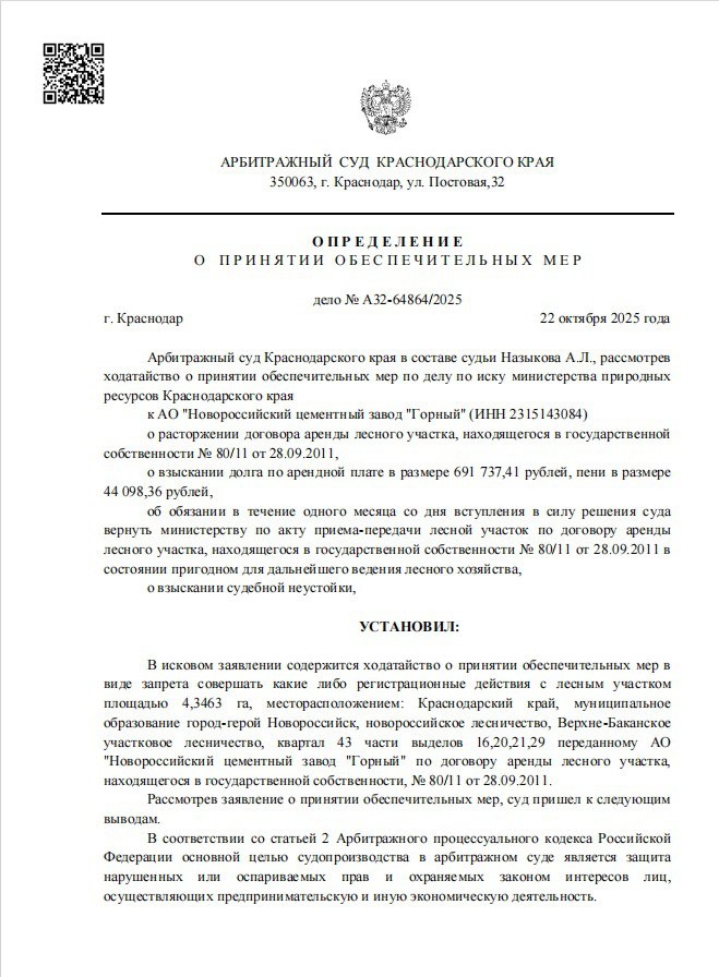 АО «Новороссийский цементный завод „Горный“» входит в состав московской компании «Цементинвест». Рассмотрение дел назначено на 1 декабря 2025 года и 22 января 2026 года.
