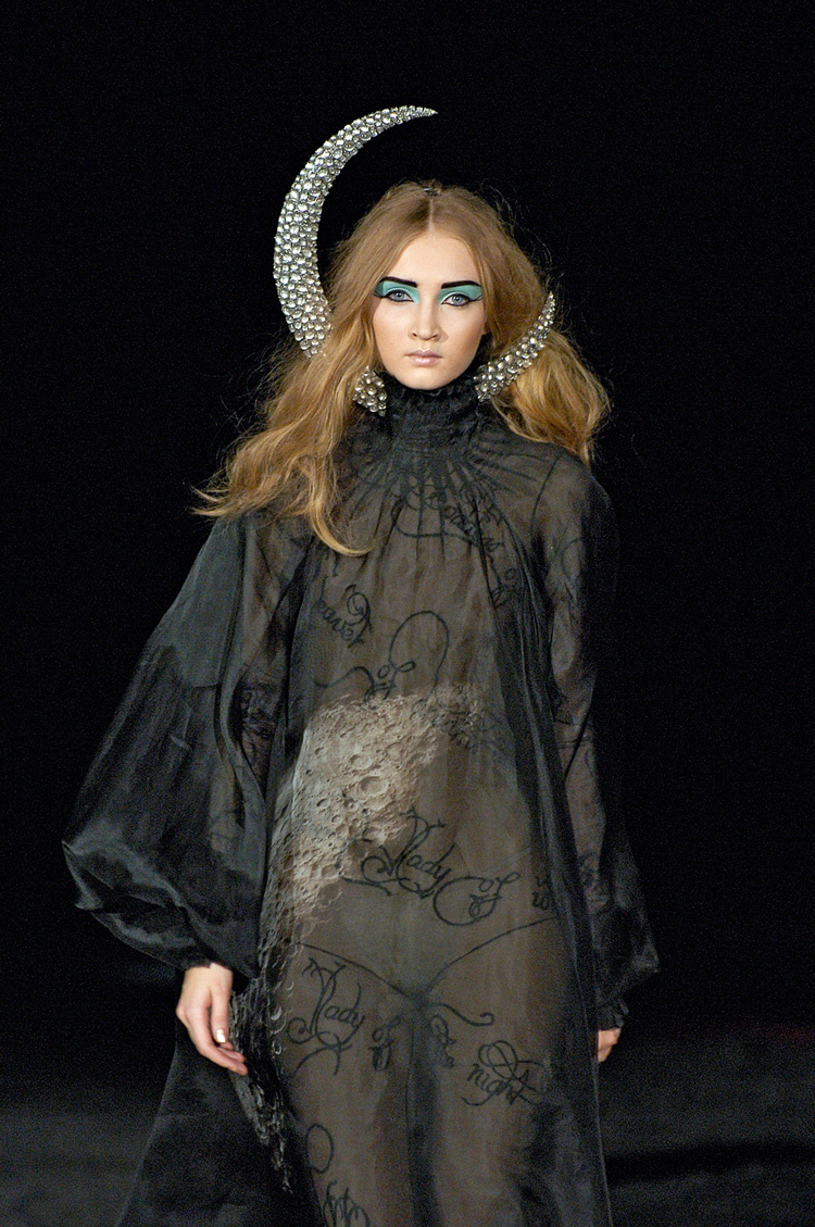 Они вышли на подиум, будто восставшие из пепла костра, и мода замерла. Коллекция Alexander McQueen Fall 2007 “In Memory of Elizabeth How” стала гимном женщинам, которых веками жгли за инаковость. Черное кружево, бархат, перья, плащи, арканы Таро — не просто одежда, а манифест силы и боли. Маккуин превратил трагедию ведьминских охот в поэзию освобождения. В 1692 году в Салеме прошёл один из самых мрачных эпизодов американской истории — процесс над «ведьмами». Среди казнённых была Элизабет Хау (Elizabeth How), дальняя родственница Александра Маккуина. Всё началось, когда мать дизайнера, Джойс Маккуин, выяснила, что семья происходит именно от её корней, и это открытие стало эмоциональным стержнем новой коллекции. Атмосфера показа была мистической: зал окутывал дым, на полу — огромная пентаграмма, по краям которой модели двигались, будто участницы древнего ритуала. Маккуин создал визуальную симфонию между ужасом и красотой, превращая суд над ведьмами в акт модного возмездия. Макияж дл