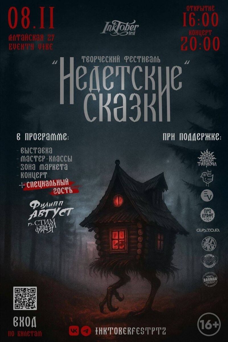 📌ТОМСК 🔥🔥 Inktober fest pt. 2: "Недетские сказки".🔥🔥 Время: 8 ноября 2025, с 16 до 00:00 Место: г. Томск, пространство "Eventy Vibe", Алтайская 27 🌟 Тематическая выставка томских художников на тему "Недетских сказок". 🌟 Мастер-классы 🌟 Зона маркета 🌟 Концертная программа 🌟 Специальный гость - Филипп Август Это не просто сказки — это переосмысленные истории, мифы и легенды, с которыми мы знакомы с детства, которые заставляют задуматься, раскрывают сложные эмоции индивидуального восприятия и дарят свежий взгляд на давно знакомое. Здесь нет места для наивности и упрощения, зато есть глубокий смысл, неожиданные повороты и яркие художественные образы. 🌟 Купить билет онлайн 🌟