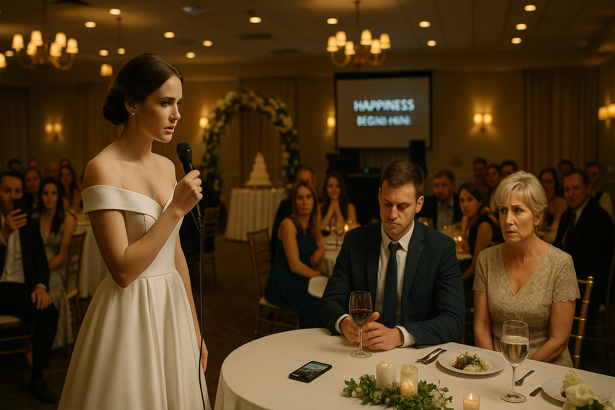 Невеста перевела взгляд на гостей, обводя зал медленным движением. Микрофон не дрожал в руке.