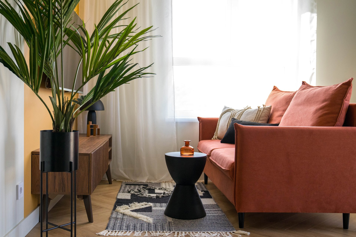 Терракота, яркие акценты и дух странствий — в этой квартире царит атмосфера непринужденного уюта и насыщенной жизни. Побывав в Турции, заказчица влюбилась в интерьер квартиры, которую снимала. Фотографии арендных апартаментов с зелеными стенами и терракотовой плиткой стали референсами для будущего ремонта. Планировка от застройщика предусматривала наличие отдельной комнаты и кухни-гостиной. Дверной проем в спальню перенесли из коридора в кухню — так удалось освободить место для хранения в прихожей. Других изменений не потребовалось. Кухонный гарнитур с фасадами оливкового цвета выполнен на заказ по индивидуальным меркам. Акцентным элементом стала обеденная группа в темном оттенке. Обратите внимание на фасады кухни. Чтобы организовать больше мест хранения, под потолком спроектировали антресоли — таким образом добились максимальной вместимости на небольшой площади. В качестве центрального элемента кухни-гостиной был выбран яркий диван Слипсон Мини от divan.ru. Модель раскладная — при не