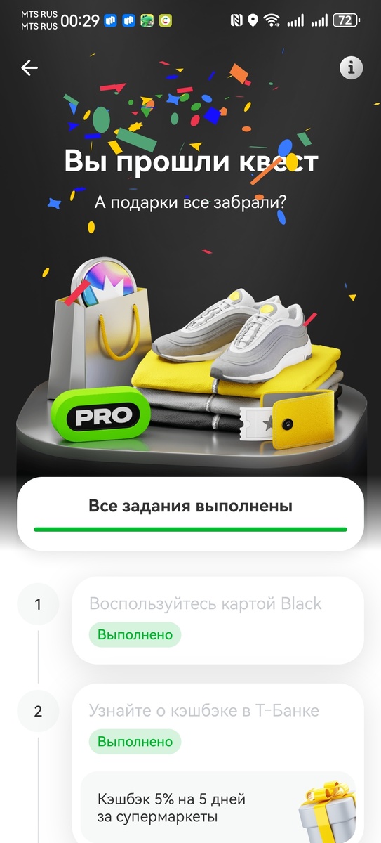Я люблю разные конкурсы, квесты, игры в мобильном приложении банка и всегда стараюсь участвовать. Даже в случае полного невыигрыша - не разочаруюсь, ибо знаю, что немного себя проверила и чуть повысила IQ, но ничего не потеряла в деньгах. Можно сказать, что я человек азартный, но в меру))) Итак, в приложении Т-Банка появилось предложение ПРОЙТИ КВЕСТ. Почему бы не поучаствовать? Задания несложные от слова «совсем». Всего - 12 заданий, как месяцев в году. Сначала нужно было воспользоваться дебетовкой. Без проблем! Покупка на 119 ₽ - в зачёт. Далее - проверить информацию о кешбэке и воспользоваться предложением 5% на супермаркеты в течение пяти дней. Это ещё и выгодно - такой кешбэк на покупки в магазинах мне не предлагали! Ещё одни заданием было отгадать слово в игре «5 букв». Легко! Сделано. Очередное - неожиданная радость за перевод родственникам. Тут же перевела «неожиданно»... Итог - выполнение пятого задания - пополнить дебетовку от 1 000 ₽. Собственно, следующее задание - купить