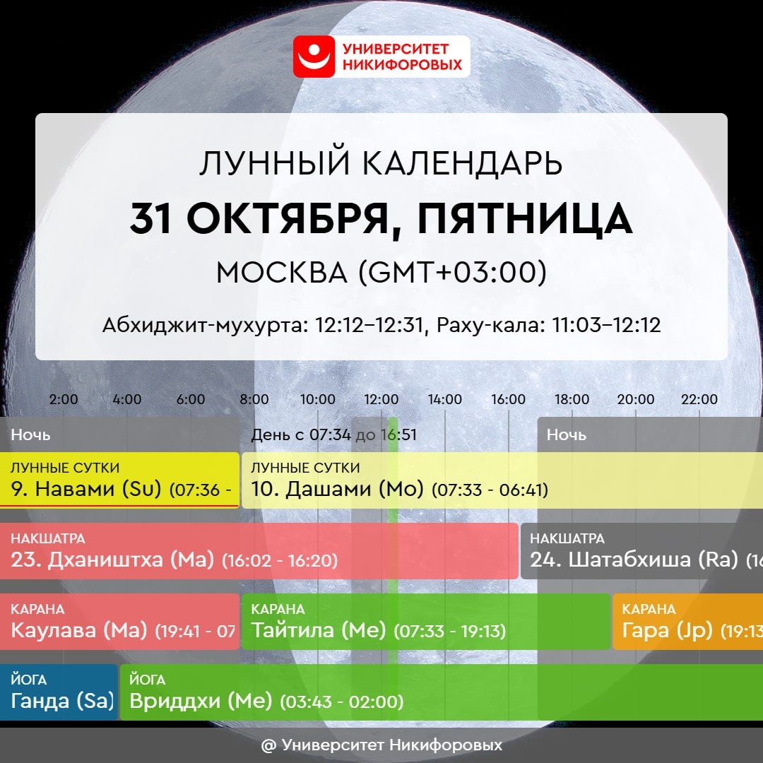 31 ОКТЯБРЯ, ПЯТНИЦА Энергетика дня подвижная, достаточно благоприятная. До 16:20 она способна дать рост и поддержку начатому. В целом день подходит для бизнеса и проведения групповых мероприятий, он поддержит виды деятельности, которые требуют активной позиции и проявлений агрессии. Использование техники и технологий поможет решить задачи этого дня. Время после 16:20 подходит для лечения и прохождения оздоровительных процедур – могут поддаться исцелению даже хронические недуги. Это также хороший момент для учебы и изучения, в том числе астрологии и астрономии. Почитайте сегодня о Венере, узнайте об особенностях ее движения и истории исследований этой планеты. Сегодня может ощущаться напряженность в отношениях и присутствовать излишне критичное восприятие в вопросах красоты и комфорта. Процедуры по изменению имиджа лучше перенести на другой день.