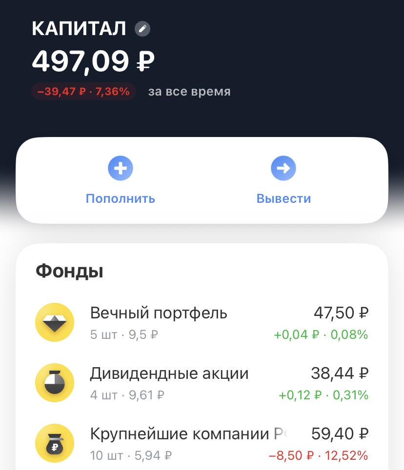 Весьма глупая затея, учитывая размер моих доходов здесь.) Но тем не менее, она мне кажется достаточно интересной. Хоть и глупой при этом тоже, конечно же. Одно другому не мешает. Я наконец-то продала акцию, купленную в долг у себя же, долг себе вернула. А бумаги почему-то вдруг (почему?) растут в цене наконец-то и теперь мой капитал стал чуть ближе к той сумме, которую я в него вложила. Я отправляю на брокерский те копейки, что получаю с Дзена, так как хочу их как-то зафиксировать и сохранить. Ну и сам по себе этот этот дурацкие челлендж вообще планировался в том числе и как некий катализатор интереса к моему в блогу, что должно было логичным образом повысить и доход, ну хоть на чуть-чуть. Пока мы данного явления не наблюдаем, как видите. На сегодня мною в этот капитал отправлено всего 550 рублей. А на брокерском вот сколько: Вторая часть: И это рынок типа в плюс пошел в последние пару дней. В минусе было еще хуже! А на накопительном счете капали бы проценты каждый месяц и вс