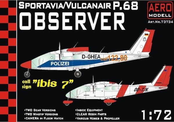 Немецкая Aero-Modell выпустила смоляную модель Sportavia/Vulcanair P.68 Observer в масштабе 1/72 с разными декалями в двух наборах: Sportavia/Vulcanair P.68 Observer call sign "Ibis 7" (каталожный номер 73734) Partenavia P.68 Vulcanair P68 Victor Royal Bahama Defence Force (73736)