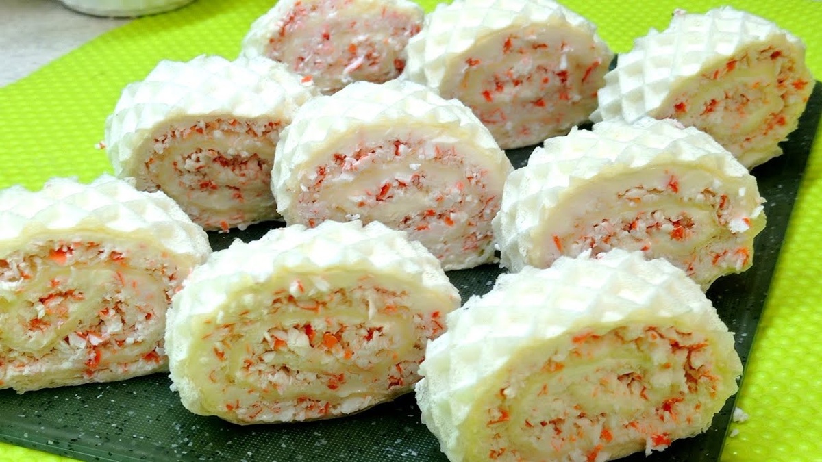 Этот рулет станет настоящим украшением вашего праздничного стола! Нежное сочетание крабовых палочек, плавленого сыра и чесночной намазки на мягком вафельном листе покорит всех своей лёгкостью и изысканным вкусом.