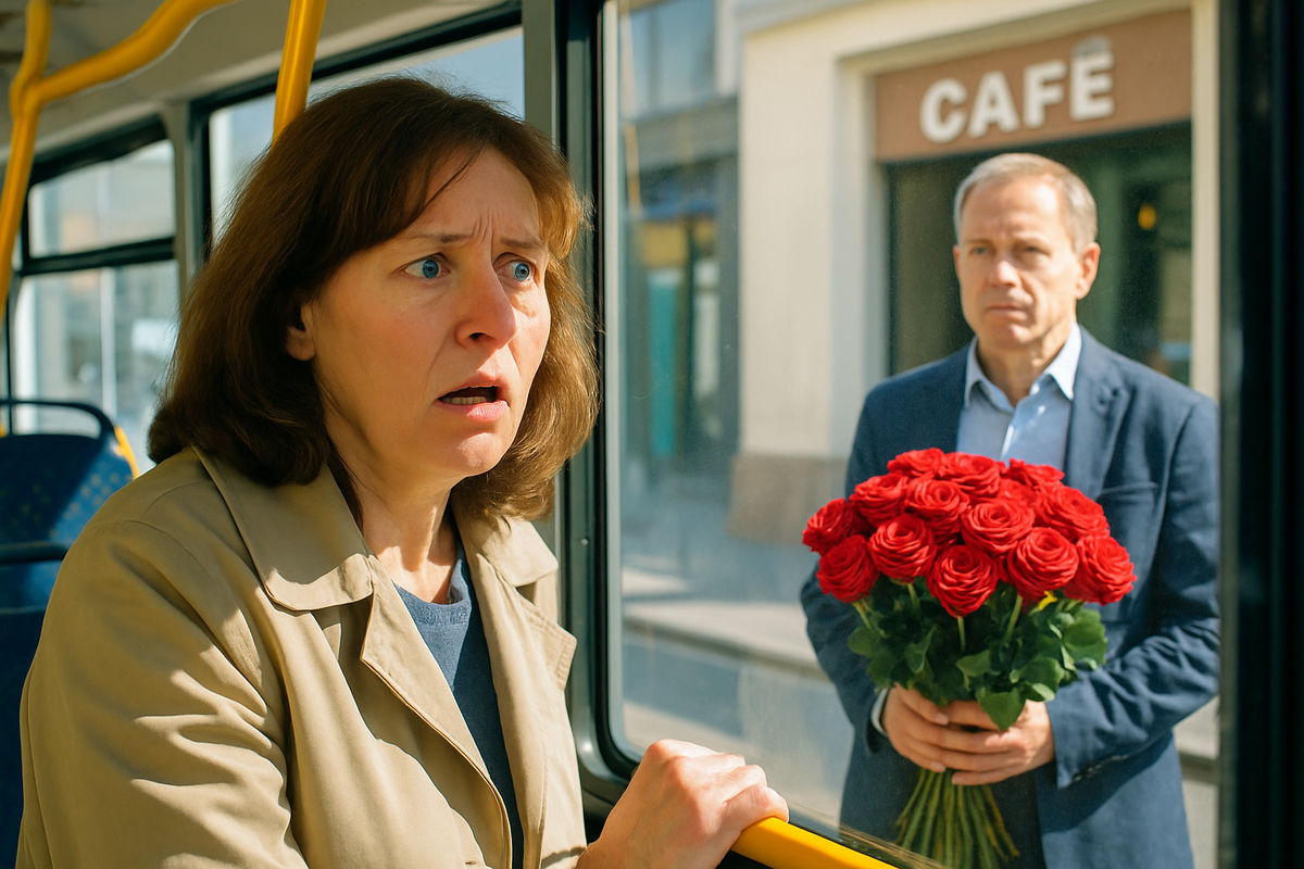 Автобус дёрнулся и остановился. Людмила собиралась выйти, но в этот момент за окном что-то привлекло её внимание. На тротуаре, у входа в кафе «Незабудка», стоял мужчина с огромным букетом алых роз. Он нервно поглядывал на часы, явно кого-то ожидая.