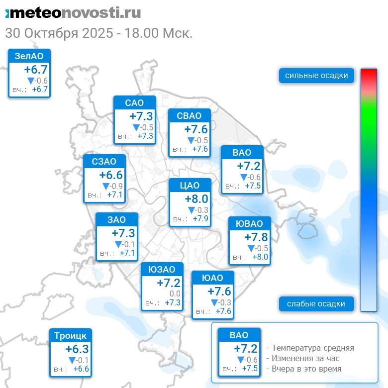 В 18:00 в Москве было от +5.9°C до +8.1°C, средняя температура +7.3°C #погода #Москва #осень #температура #30октября #четверг