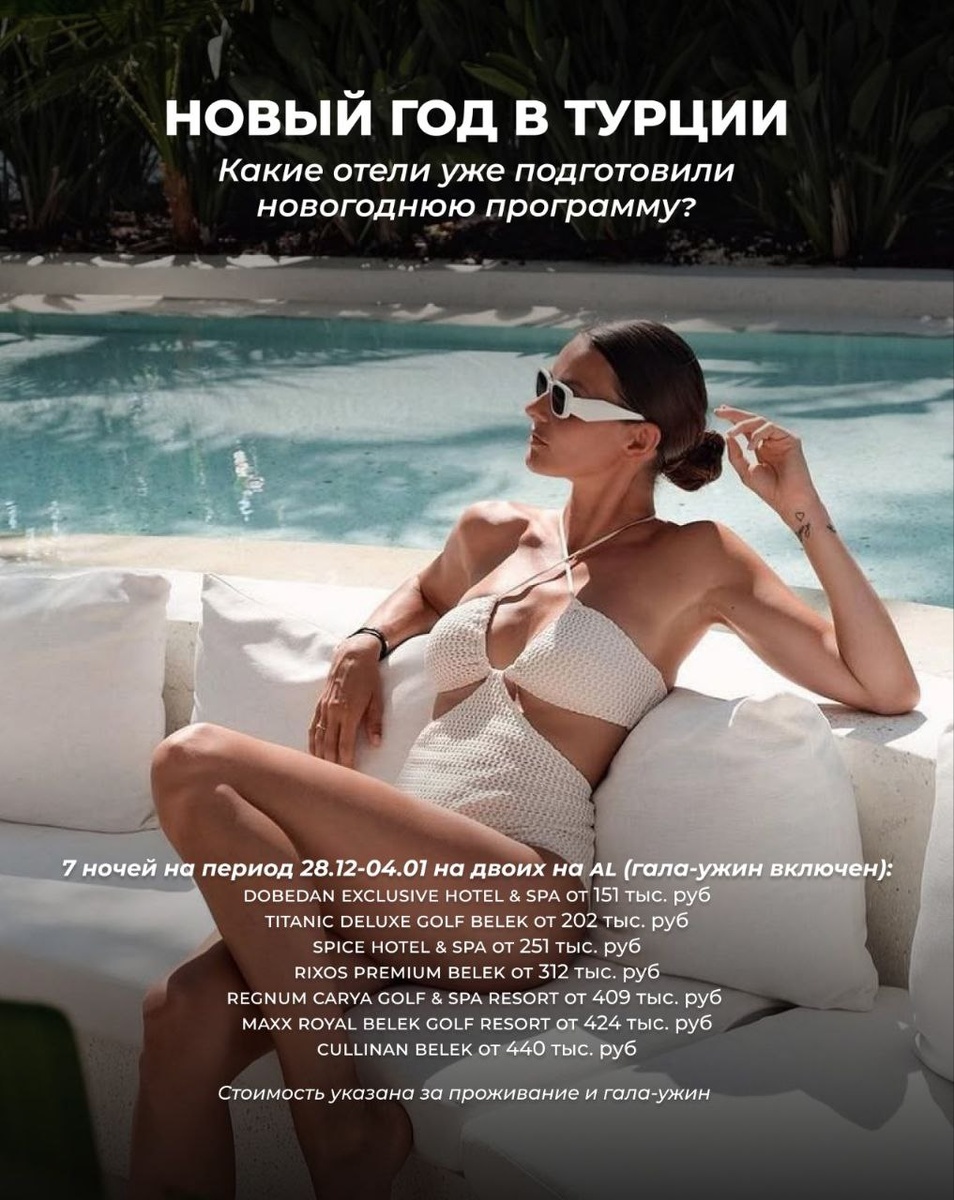 🎄 Новый год в Турции 🇹🇷 Какие отели уже подготовили новогоднюю программу? 🥂 Оркестры, DJ-шоу, концертные программы с живой музыкой, танцевальные и файер-шоу, и многое другое ждёт вас в отелях Турции в новогоднюю ночь🤩 7 ночей на период 28.12-04.01 на двоих на Всё включено (гала-ужин включен): ✨ Sherwood Exclusive Lara от 119 тыс. руб 🌟 Dobedan Exclusive Hotel & Spa от 151 тыс. руб ✨ Titanic Deluxe Golf Belek от 202 тыс. руб 🌟 Kaya Palazzo Golf Resort Belek от 202 тыс. руб ✨ Calista Luxury Resort от 245 тыс. руб 🌟 Concorde De Luxe Resort от 250 тыс. руб ✨ Spice Hotel & Spa от 251 тыс. руб 🌟 Rixos Premium Belek от 312 тыс. руб ✨ Regnum Carya Golf & Spa Resort от 409 тыс. руб 🌟 Maxx Royal Belek Golf Resort от 424 тыс. руб ✨ Cullinan Belek от 440 тыс. руб Стоимость указана за проживание и гала-ужин‼️ Перелет бронируем отдельно или покупаете билеты самостоятельно на желаемый рейс комфортной для вас авиакомпанией. Забронировать тур и задать вопросы: ☎️ +7 (905) 717-51-97 Вера