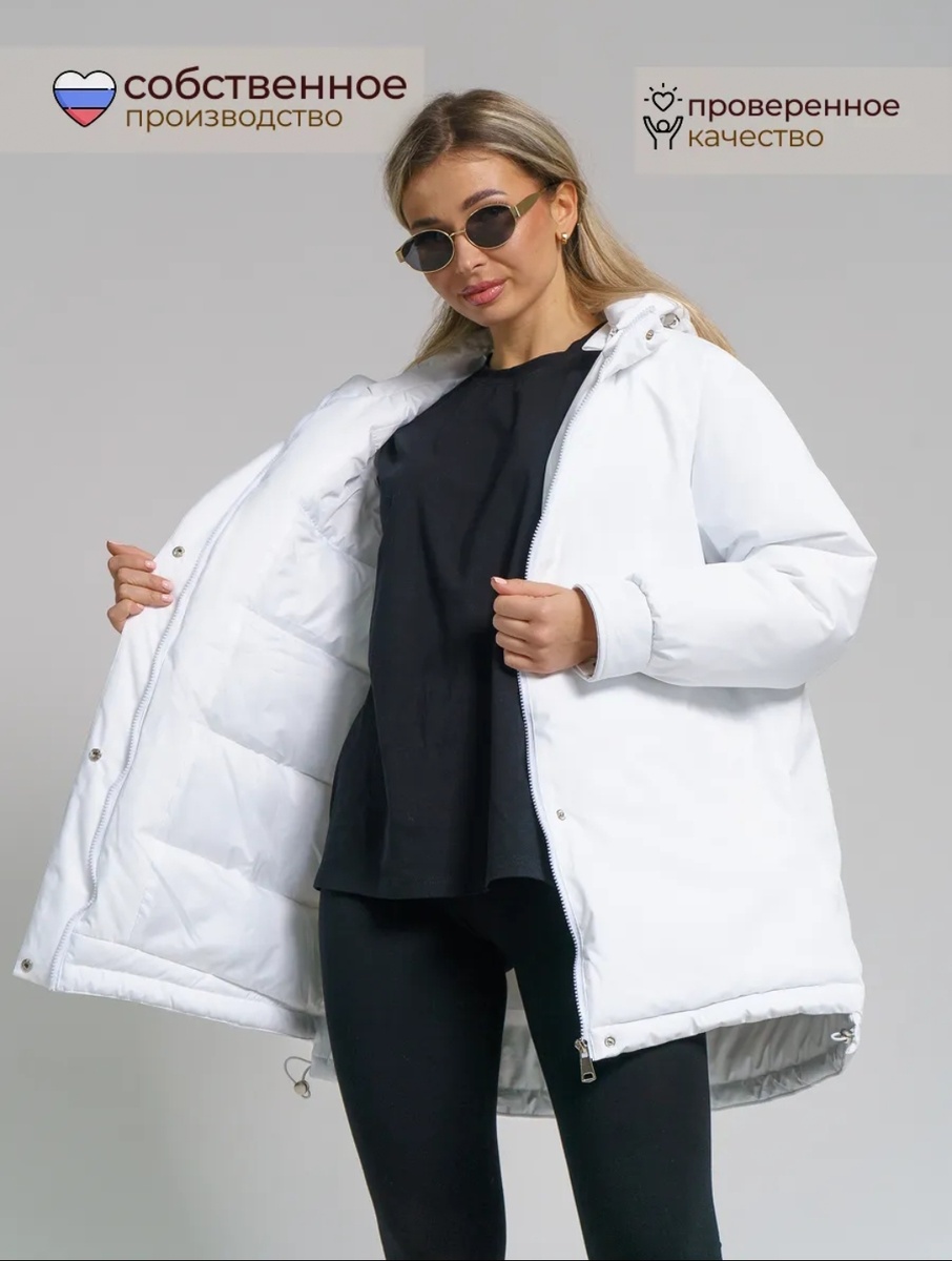 Удлиненный фасон в стиле оверсайз сочетается с резинкой по нижнему краю для регулировки посадки. Объемные карманы и капюшон повышают функциональность. Модель подходит для женщин разных возрастов и типов фигур.