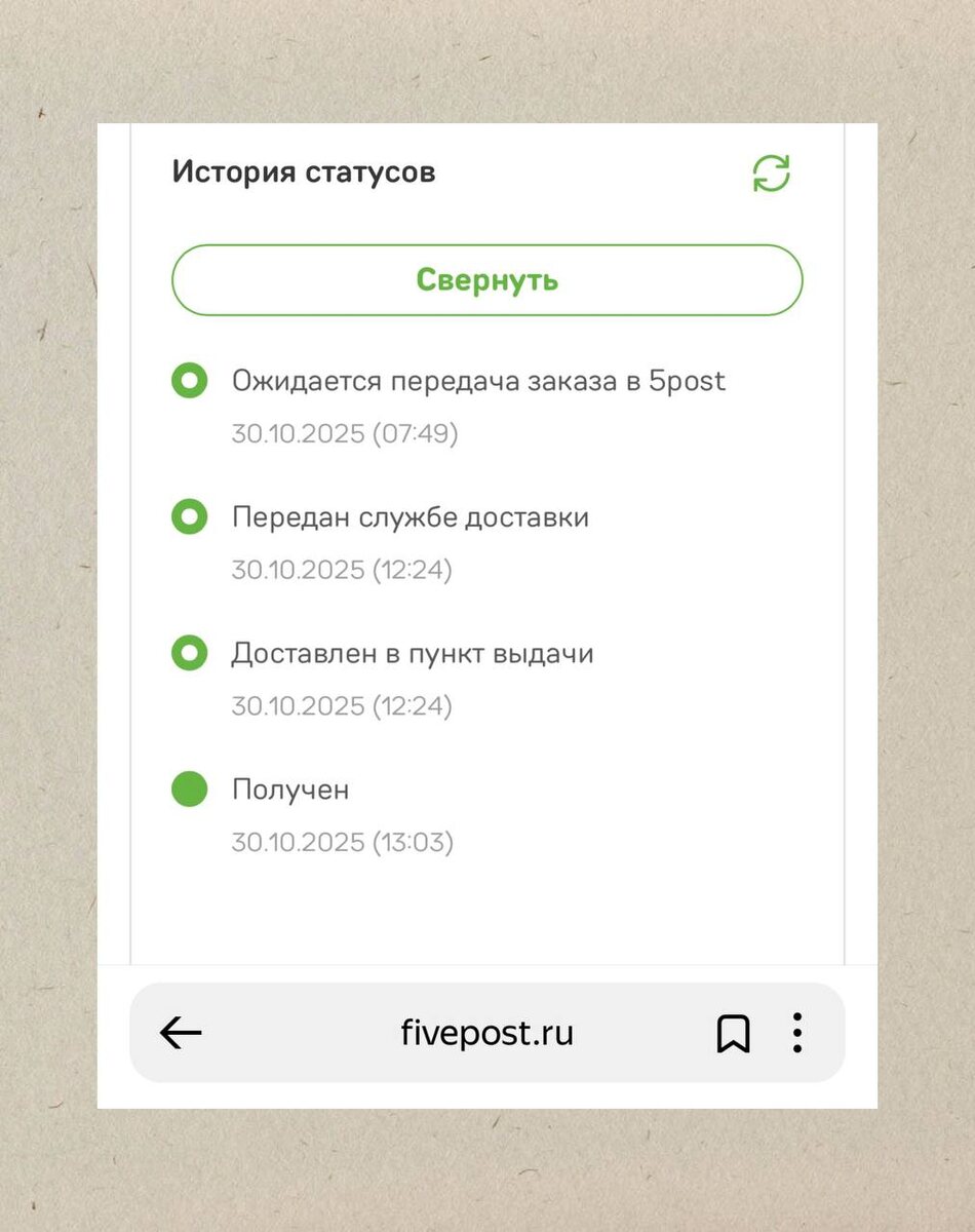 Как я «поработала» курьером 5Post 😄 Сегодня получила заказ на кроссовки (из последнего лота). Покупатель оказался из моего города и выбрал постамат 5Post, который находится недалеко от меня. Я решила отправить посылку через этот же постамат — было интересно, отправят ли её на сортировку или система поймёт, что пункт тот же. В общем, только разместила посылку — и она сразу получила статус «доставлен». А уже через полчаса покупатель её забрал. Получилось, что сегодня я поработала и сортировкой, и курьером 5Post одновременно 🤣