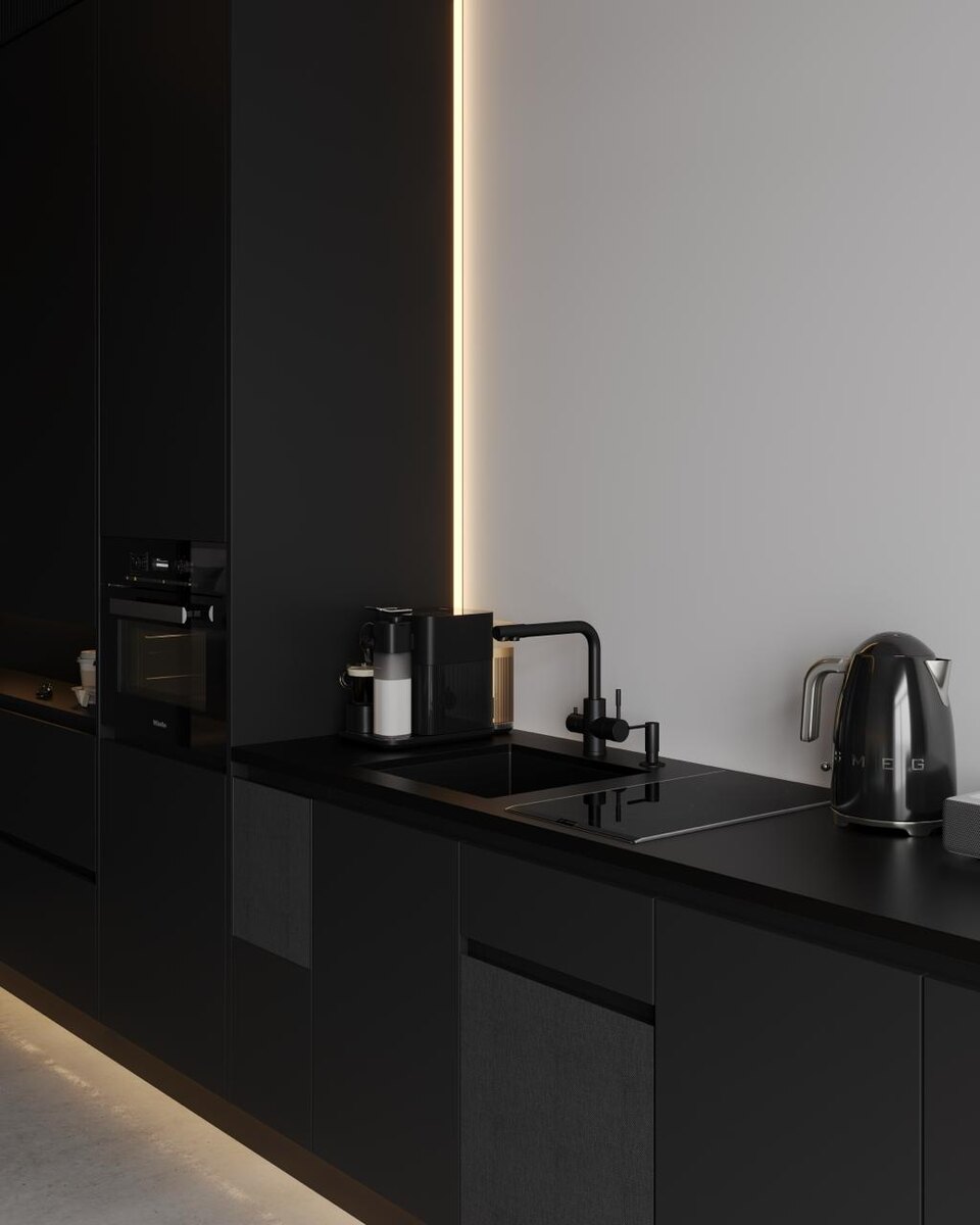 Делимся проектом в ЖК Метрополия, студия 24м2 Матовая чёрная кухня в одну линию плавно переходит в рабочий стол Тёплые контурные подсветки по периметру и у изголовья — вечерний «режим тихо» Стеклянный бокс санузла — графичный акцент, даёт глубину и световые отражения. Сырой бетон потолка + светлый пол = характер без визуального шума Нравится такая эстетика?