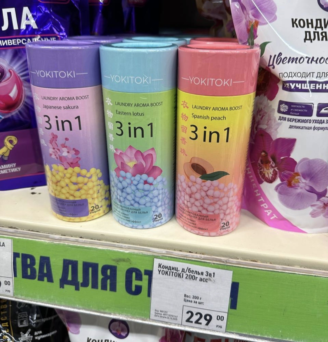 В продаже есть новый гранулированный парфюмированный кондиционер для белья YOKITOKI. На выбор три аромата. Масса 200 гр. Упаковка рассчитана на 20 стирок. Практичное средство для придания белью мягкости и приятного аромата. Удобный формат гранул упрощает дозировку и хранение. Производитель Китай. Цена 229 рублей.