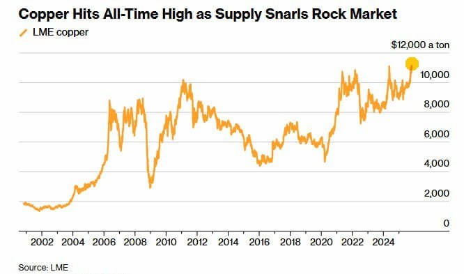 Медь Взлетает до Рекордов: Что Стоит за Новым Ценовым Ралли? 📈⚡ Мировые цены на медь демонстрируют впечатляющий рост, обновив исторические максимумы на фоне оптимистичных ожиданий инвесторов. На конец октября 2025 года трехмесячные фьючерсы на Лондонской бирже металлов (LME) превысили отметку в $11 100 за тонну, что стало новым пиком, спровоцированным слухами о торговом соглашении между США и Китаем. Ключевыми факторами, помимо геополитики, являются продолжающийся структурный дефицит предложения из-за проблем на крупных рудниках и устойчивый спрос, подпитываемый глобальным переходом на "зеленую" энергетику. Аналитики из Trading Economics прогнозируют, что этот рост продолжится, ожидая достижения уровня свыше $12 650 за тонну в течение ближайшего года. Несмотря на возможные краткосрочные колебания, фундаментальные показатели указывают на сохранение "бычьего" тренда для этого ключевого промышленного металла. #новости #БезПафосаФинансы #металлы #инвестиции