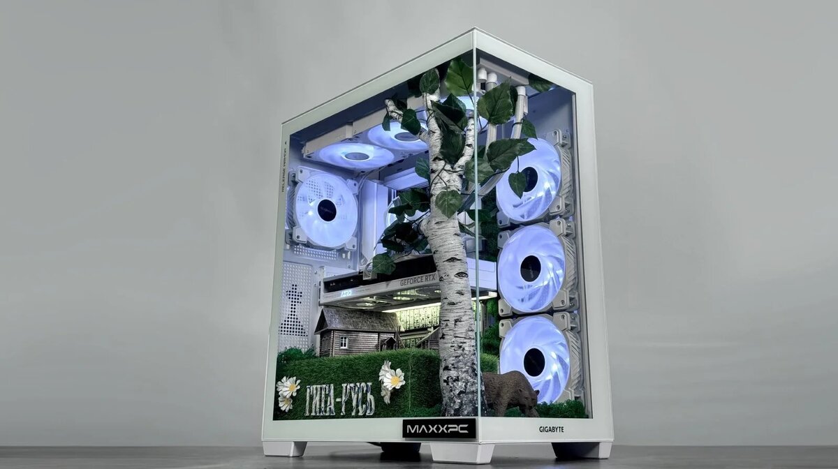 В честь Дня народного единства российская мастерская кастомных ПК MaxxPC в партнерстве с GIGABYTE представила эксклюзивный проект — игровую станцию «ГИГА-РУСЬ». За прозрачной боковой панелью кастомного ПК развернулась целая диорама с избушкой, колодцем и пластиковой березой, подсвеченная переливами кулеров. Снаружи корпус этого компьютера расписан традиционными узорами в стиле гжель. Техническое оснащение проекта соответствует его яркому внешнему виду. За производительность отвечает связка из процессора Ryzen 7 7800X3D и видеокарты RTX 5060 Ti с 16 ГБ видеопамяти. Основой для сборки послужила материнская плата B850 AORUS STEALTH ICE, а дополняют ее 32 ГБ ОЗУ