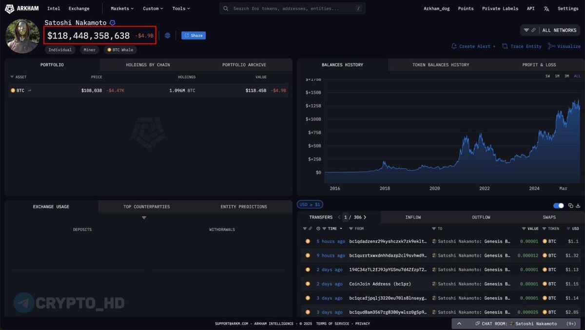 👀 За сутки Сатоши Накамото обеднел почти на $5,000,000,000 – Arkham