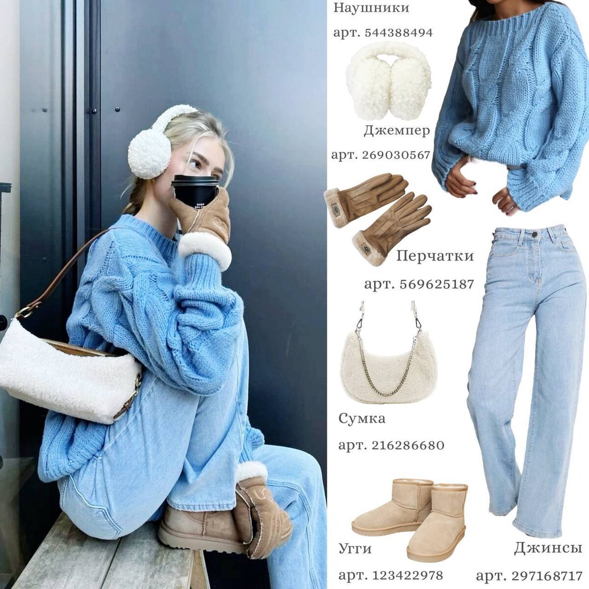 Ноябрь не обязательно должен быть серым. Когда за окном пасмурно, самое время добавить в гардероб немного цвета — не кричащего, а выразительного, способного поднять настроение и вдохновить. Яркие детали — это не просто мода, это способ подарить себе энергию, уверенность и ощущение жизни. Вот 5 образов с WB, в которых уют встречается со стилем, а цвет становится главным инструментом самовыражения. Перейти прямо к данному посту в Telegram с активными ссылками на вещи Мягкий голубой джемпер и светлые джинсы создают ощущение утреннего света, пробивающегося сквозь туман. Образ наполнен свежестью и спокойствием — в нём хочется пить латте на ходу, слушая плейлист с любимыми треками. Угги, перчатки и наушники в тёплой бежевой гамме добавляют уют и делают образ практичным. Этот комплект идеально подойдёт для прогулки по городу, воскресного бранча или короткого путешествия за вдохновением. Совет: попробуй сочетать такие светлые тона с нейтральным макияжем и лёгкими волнами в волосах — получится
